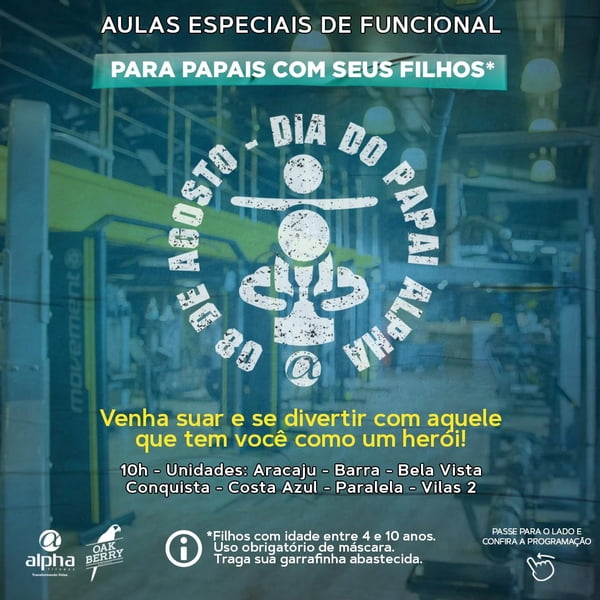 Pais presentes participam de todas as nossas conquistas. Sempre torcendo e nos inspirando cada vez mais. Alguns recebem o apelido de herói, paizão, amigo, ou até mesmo parceiro, mas o fato é que os pais dedicados são grandes incentivadores e exemplos de vencedores. Assim, para homenagear os pais, a Rede Alpha Fitness elaborou uma semana com aulas especiais, como funcional e natação, todas dedicadas a unir pais e filhos durante a atividade física. As aulas especiais irão até o dia 08 de agosto e estão disponíveis em todas as unidades. “A Rede Alpha Fitness não poderia deixar de homenagear os pais. Nosso objetivo é promover a interação entre pais e filhos e deixar essa data ainda mais espaecial. Todos os alunos são convidados a participar”, conta Marcílio Duarte, Diretor de Marketing da Rede Alpha Fitness. Para conferir a programação especial, basta acessar o perfil da rede no Instagram (www.instagram.com/redealphafitness).
